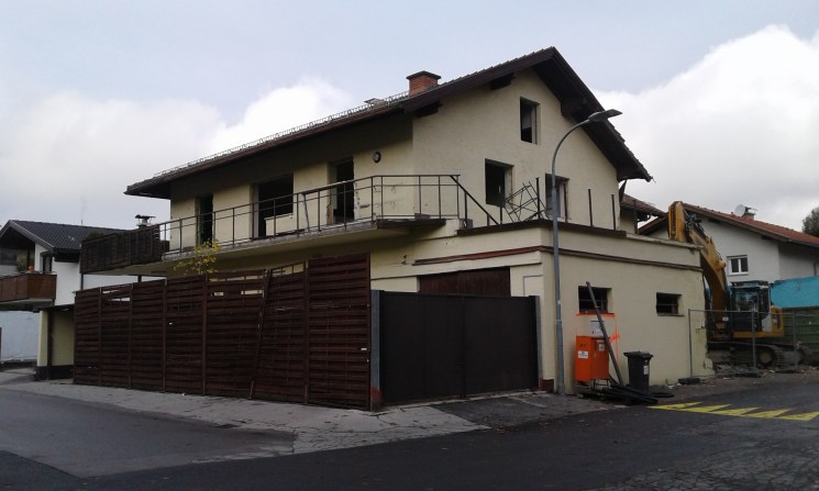 Die Rückseite des „Altpradl“, an welcher mit den Arbeiten begonnen wurde – der unpassende erkerähnliche Anbau wurde dabei geschliffen; Aufnahme: September 2019.