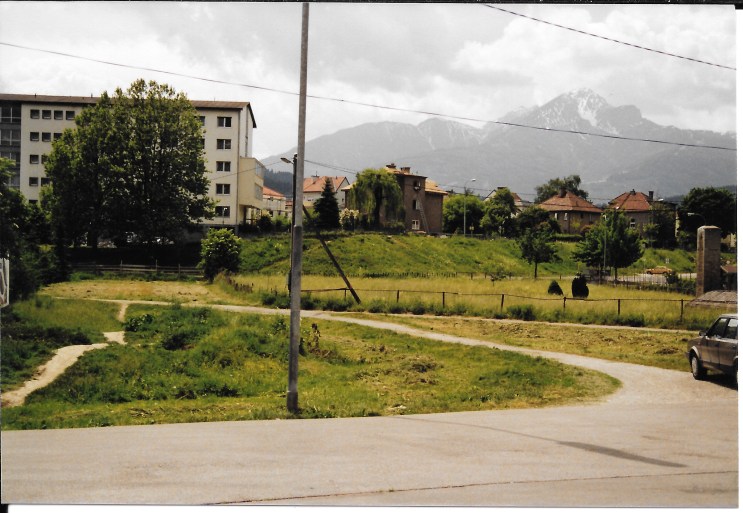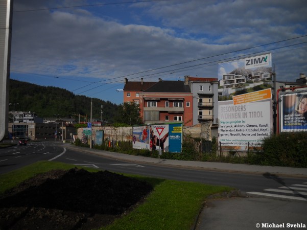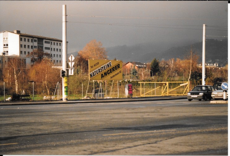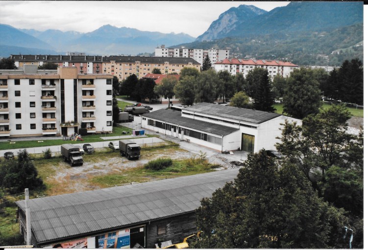 Blick auf die Kreuzung Andechsstraße – Langer Weg im November 1992: Die Vorstellung, dass fast 30 Jahre später an dieser Stelle Wohnbauten stehen werden, ist zu dieser Zeit noch schier unmöglich. Links im Hintergrund der nördliche Wohntrakt des Wohnheims Pradl – ebenfalls schon Geschichte….