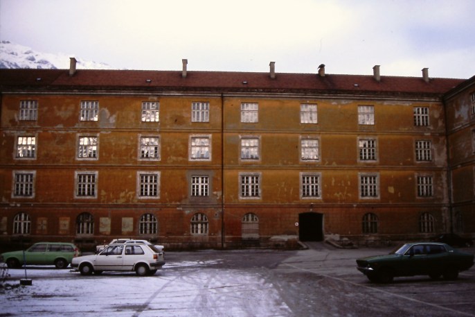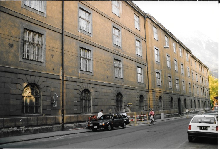 Der Ostflügel der ehemaligen Klosterkaserne mit der Durchfahrt in Richtung Kaiserjägerstraße; Aufnahme: Winter 1992.