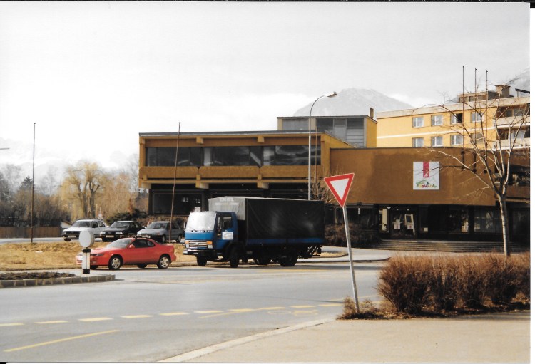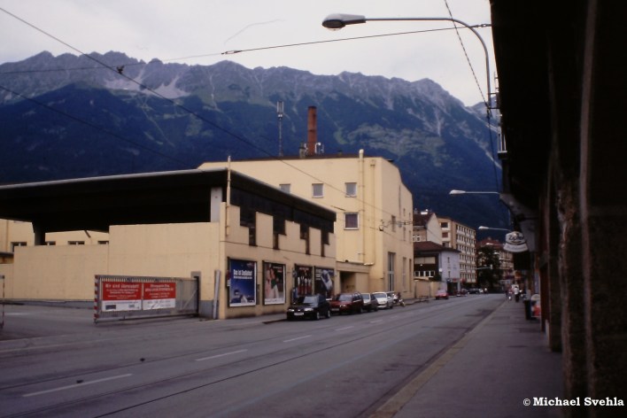 Innrain 143 – die ehemalige Postgarage. Heute befindet sich an dieser Stelle das Medicent Innsbruck; Aufnahme: November 1998.