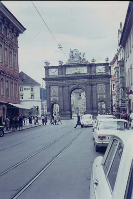 Triumphpforte mit dem ehemaligen Café Greif (das ebenerdige Gebäude links daneben); Aufnahme: um 1970.