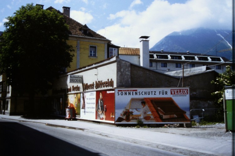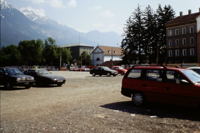 Die Häuserlücke am Innrain mit dem Cafè „Nie wo“ und dem großen Parkplatz kurz vor der Universitätsbrücke – heute befindet sich an dieser Stelle das wuchtige Gebäude mit einer Spar-Filiale im Erdgeschoß; Aufnahme: Oktober 1995.