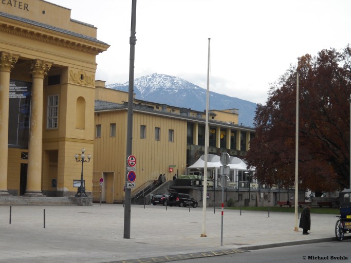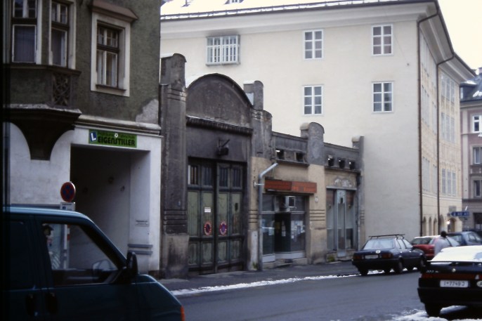 Die Erlerstraße mit dem rückwärtigen Eingang ins „alte“ Kaufhaus Tyrol sowie der ehemaligen Caritaszentrale. Das Reklameschild oberhalb des „P“ weist auf das ebenfalls nicht mehr existierende Hotel „Maria Theresia“ hin. Dort gab es auch einen Durchgang durch den optisch wenig reizvollen Innenhof, den ich selbst gerne als Abkürzung zum Sparkassenplatz verwendet habe; Aufnahme: März 1998.