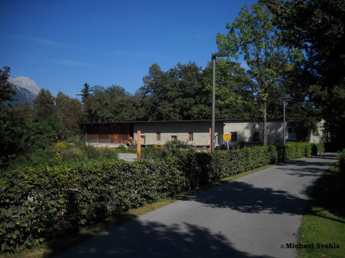 Sillinsel beim Sillpark – bis vor ein paar Jahren stand an der Stelle des heutigen Wohnkomplexes dieses ebenerdige Gebäude – der Radweg blieb unverändert …; Aufnahme: September 2011.