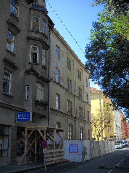 Müllerstraße 11 kurz vor dem Abbruch – im Hintergrund sieht man noch das ehemalige Hotel „Mozart“ vor dessen Umbau und Aufstockung; Aufnahme: September 2011.