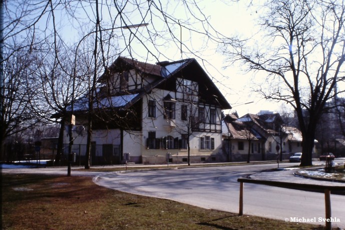 Auf besonderen Wunsch meines Cousins Rene: Blick in die Premstraße Richtung Westen – das Domizil meiner Großeltern für fast 60 Jahre. Laut den Erzählungen meines Vaters hatte sich an diesem Blick seit dem Erstbezug 1940 so gut wie nichts verändert. Erst Mitte der 1960er Jahre wurde die Straße asphaltiert, mit dem aufkommenden Wohlstand konnten es sich die Mieter leisten, die Balkone zu verglasen. Viele haben sich dann später dort das Bad einbauen lassen – die Wohnungen besaßen in der Grundausstattung nämlich kein eigenes Badezimmer; Aufnahme April 2010.