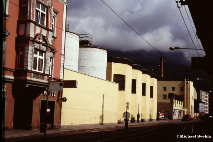 Die „ETAB“ (Erste Tiroler Arbeiterbäckerei) an der Haller Straße im Winter 1985/86. Zu dieser Zeit erlebte sie nochmals einen letzten großen Aufschwung – 11 Jahre später wurde die Produktion stillgelegt. In den nächsten 7 Jahren stand das Gebäude leer und verfiel durch unzählige Vandalenakte zusehends.