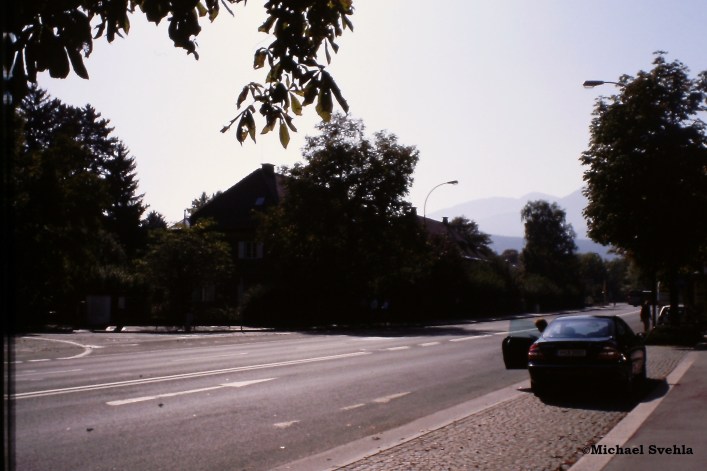 Kreuzungsbereich Reichenauerstraße-Radetzkystraße mit Blick in die General-Eccher-Straße und auf das Gelände der Eugen-Kaserne, das bis an den Kreuzungsbereich reicht. Ein „O 3“ kann man sich noch gar nicht vorstellen; Aufnahme: März 2000.