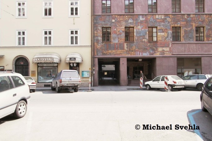 Der Haupteingang in die BTV (mit Stiegenaufgang) und die bescheidene Einfahrt in den Innenhof – darüber ist ein Teil des Sgraffitos zu sehen; Aufnahme: Mai 2002.