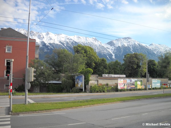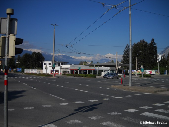 Obwohl es dieses Mal um keine Gebäude geht, möchte ich gerne zwei Aufnahmen aus der autoarmen Corona-Zeit präsentieren. Einmal die Kreuzung Amraser Straße / Rhomberg-Passage …