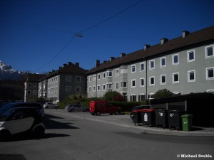 Ecke Hunoldstraße – Hörmannstraße: Blick auf den großen „Knollerstraßen-Block“ von Westen aus. Die Hausfront rechts von der Bildmitte scheint „abgeschnitten“ zu sein und ist aus zweierlei Hinsicht interessant: erstens gibt es solche Frontseiten ohne Fenster kaum in Innsbruck und zweitens zeigt die aufgemalte Werbung ein Logo der „Adambräu“-Brauerei, die es schon seit vielen Jahren nicht mehr gibt; Aufnahme: Frühjahr 2018.