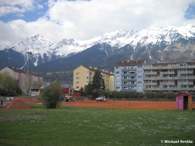 Blick auf die Überreste der Tennis-Anlage in der Radetzkystraße – im Hintergrund sind bereits die Bagger aufgefahren. Ab 2020 sollen hier in einer ersten Baustufe 300 Wohnungen entstehen; Aufnahme: März 2018.