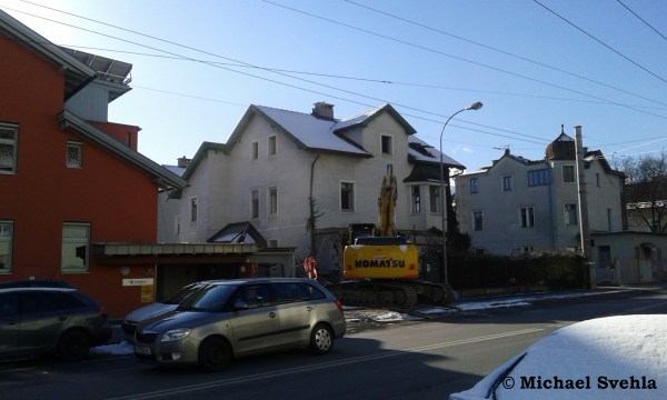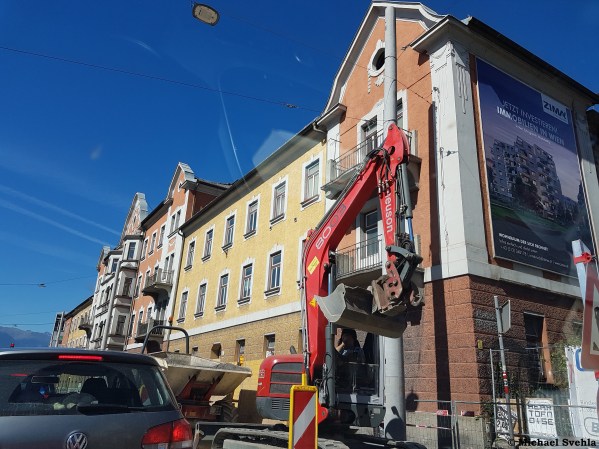 Der ehemalige Gasthof „Prugger“ an der Kreuzung Höttinger Au/Bachlechnerstraße – die Abbrucharbeiten haben soeben begonnen; Aufnahme: März 2019.