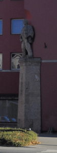 Bei näherer Betrachtung steht an der Ecke des Hauses Speckbacherstraße 41 eine steinerne Figur auf einem wuchtigen Sockel, die in ihrer Ästhetik an die NS-Zeit erinnert: Der Blick streng, aber zuversichtlich (nach Norden in Richtung Deutsches Reich?), die Haltung kraftvoll und unerschütterlich.  Was hat es damit auf sich? Die Figur stellt einen Südtiroler in Meraner Tracht dar, die an das „schicksalhafte Ereignis der Südtiroler Umsiedlung“ (Wilhelm Eppacher in: Amtsblatt der Landeshauptstadt Innsbruck, Ausgabe März 1959) erinnern soll. Sie stammt vom Südtiroler Bildhauer Albin Lanner, der während der NS-Zeit in Innsbruck u. a. 1940 die damalige Führerbüste und den Hoheitsadler im Trausaal im Goldenen Dachl sowie 1943 die Brunnenfigur „Prinzessin mit Froschkönig“ (1948 im Hofgarten aufgestellt) geschaffen hat. Ich danke Herrn Wolfgang Geisler für diesen interessanten Hinweis.