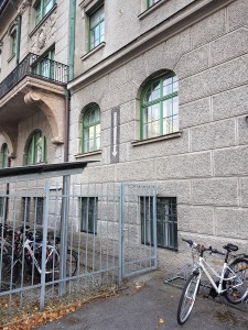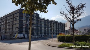 Die langgezogenen Häuserfront an der Prinz-Eugen-Straße (welche übrigens bestehen bleibt und auf dieser Aufnahme vom Oktober 2016 wärmeschutzisoliert wird) weist ähnliche Rückstufungen auf wie jene in der Türingstraße (gerade Hausnummern).