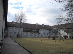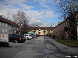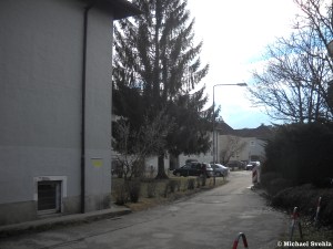 Auf besonderen Wunsch meines Cousins Rene: Blick in die Premstraße Richtung Westen – das Domizil meiner Großeltern für fast 60 Jahre. Laut den Erzählungen meines Vaters hatte sich an diesem Blick seit dem Erstbezug 1940 so gut wie nichts verändert. Erst Mitte der 1960er Jahre wurde die Straße asphaltiert, mit dem aufkommenden Wohlstand konnten es sich die Mieter leisten, die Balkone zu verglasen. Viele haben sich dann später dort das Bad einbauen lassen – die Wohnungen besaßen in der Grundausstattung nämlich kein eigenes Badezimmer; Aufnahme April 2010.