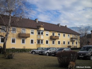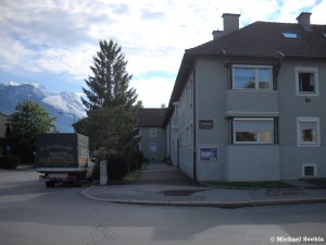 Oswald-Redlich-Straße 15 (grau) mit dem Beginn des Blockes 17-19. Auch hier wieder der typische Durchgang, welchen man auch überall in den Südtiroler Bauten in Pradl antreffen kann, allerdings immer in etwas abgewandelter Form.