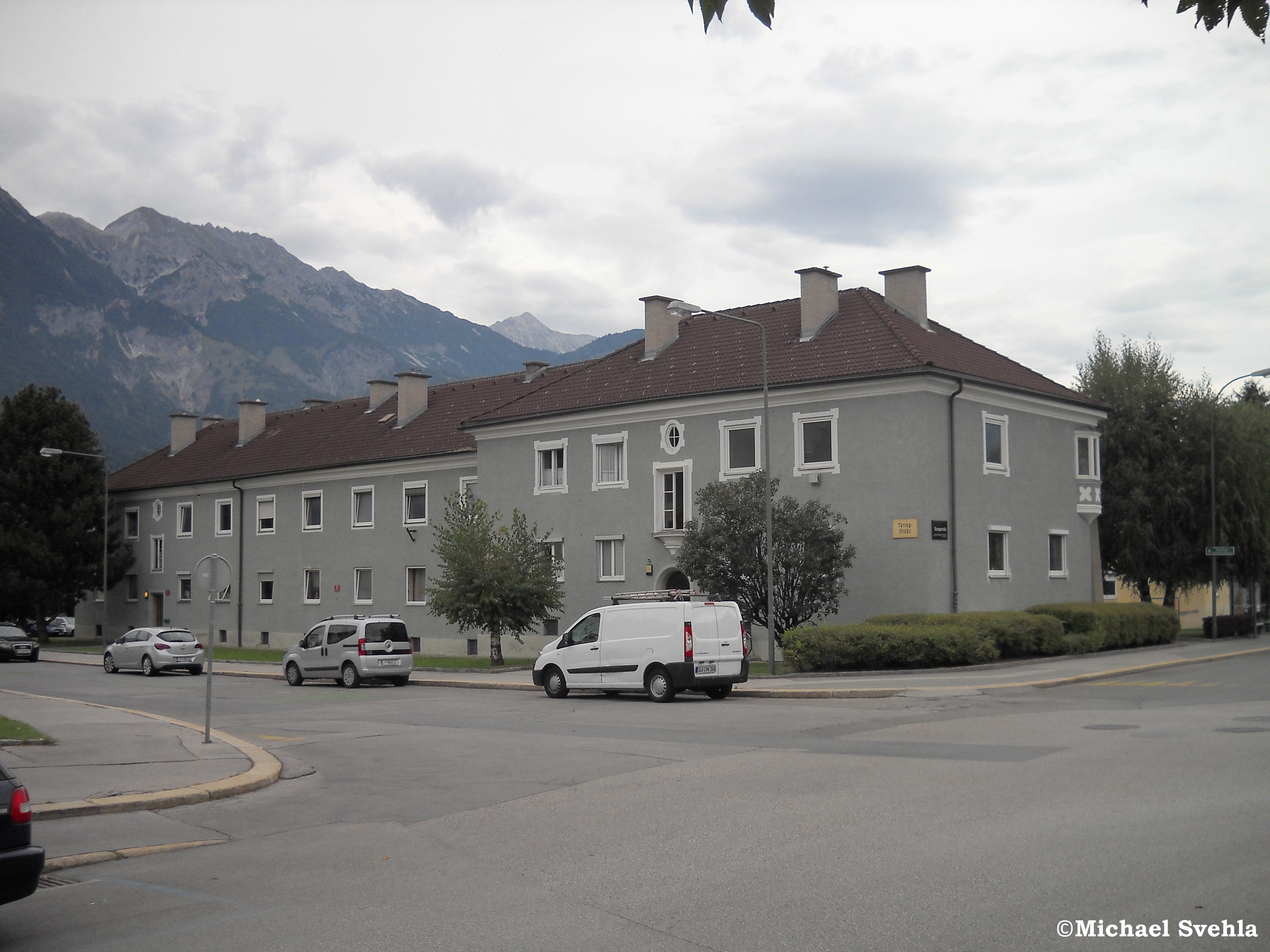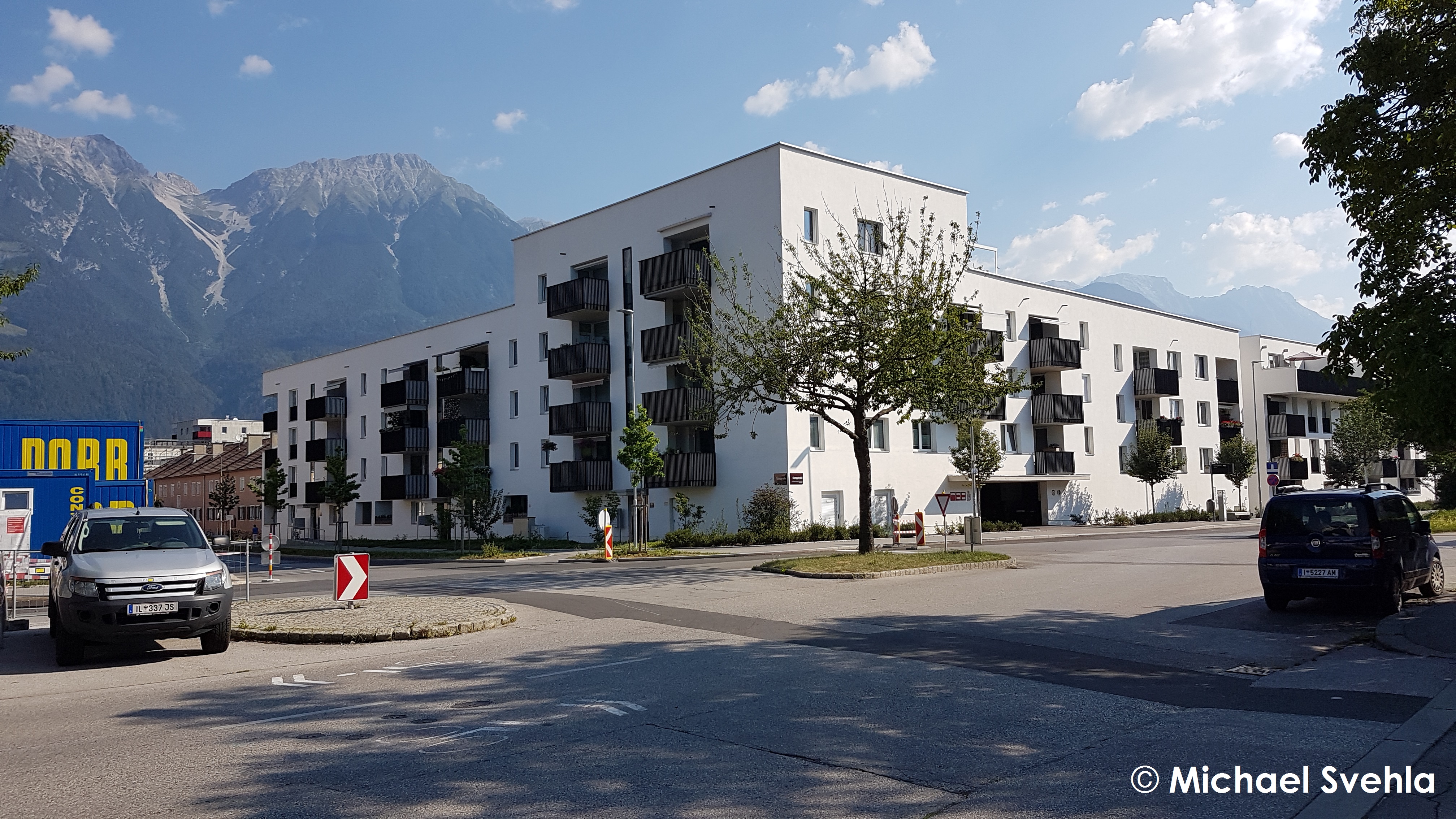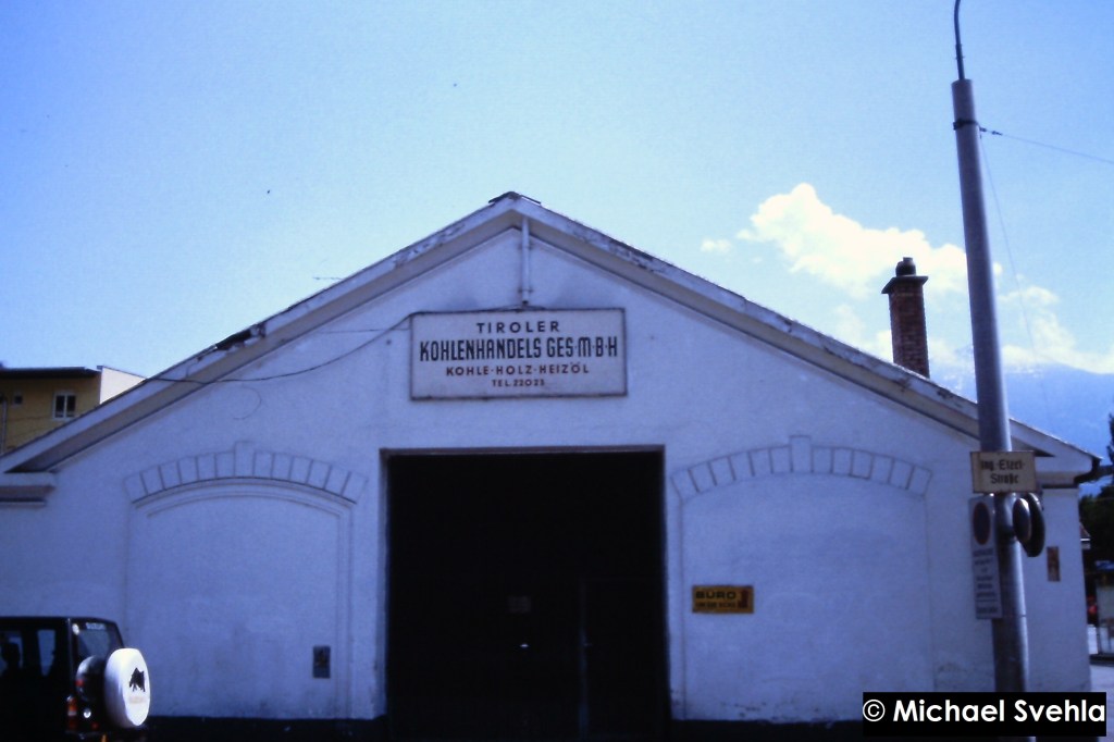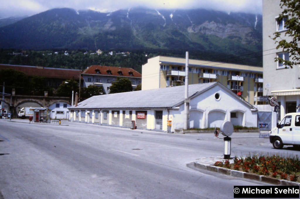 „Markant“ war dieser Block aus meiner Sicht deshalb, weil die Straßenbahn Linie 3 – von Amras kommend – an dieser Stelle rechts abbog in Richtung Pradl und in weiterer Folge zum Bahnhof. Für mich, der Mitte der 1990er Jahre in Amras wohnte, begann gefühlt ab dieser Stelle der Fahrt Pradl und quasi die City, was sich an der Anzahl der zusteigenden Fahrgäste deutlich bemerkbar machte.
