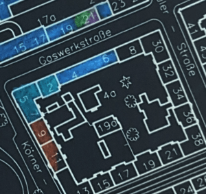 Durch die farblichen Abgrenzungen lassen sich die einzelnen Blöcke gut unterscheiden: v.l.n.r. Gumppstraße 38 und Langstraße 23-25 (gelb), 27-29 (rot) sowie 31-35 (grau).