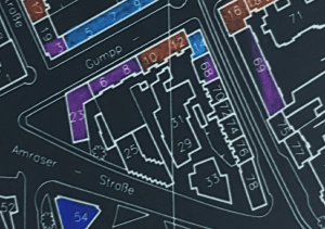 Blick auf die vier Hausnummern (v.l.n.r.) 58, 56, 54 und 52. Der folgende Link zeigt den Block mit dem LS-Pfeil, wie er sich während der Jahre 1943-45 darstellte: http://innsbruck-erinnert.at/der-pfeil/